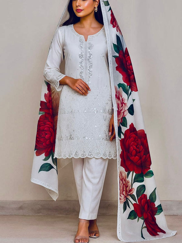 - Heavy Embroidered Neck - Heavy Embroidered Sequence Chicken Karri Shirt - Embroidered Sleeves - Silk Embroidered Dupatta - Air Jet Trouser